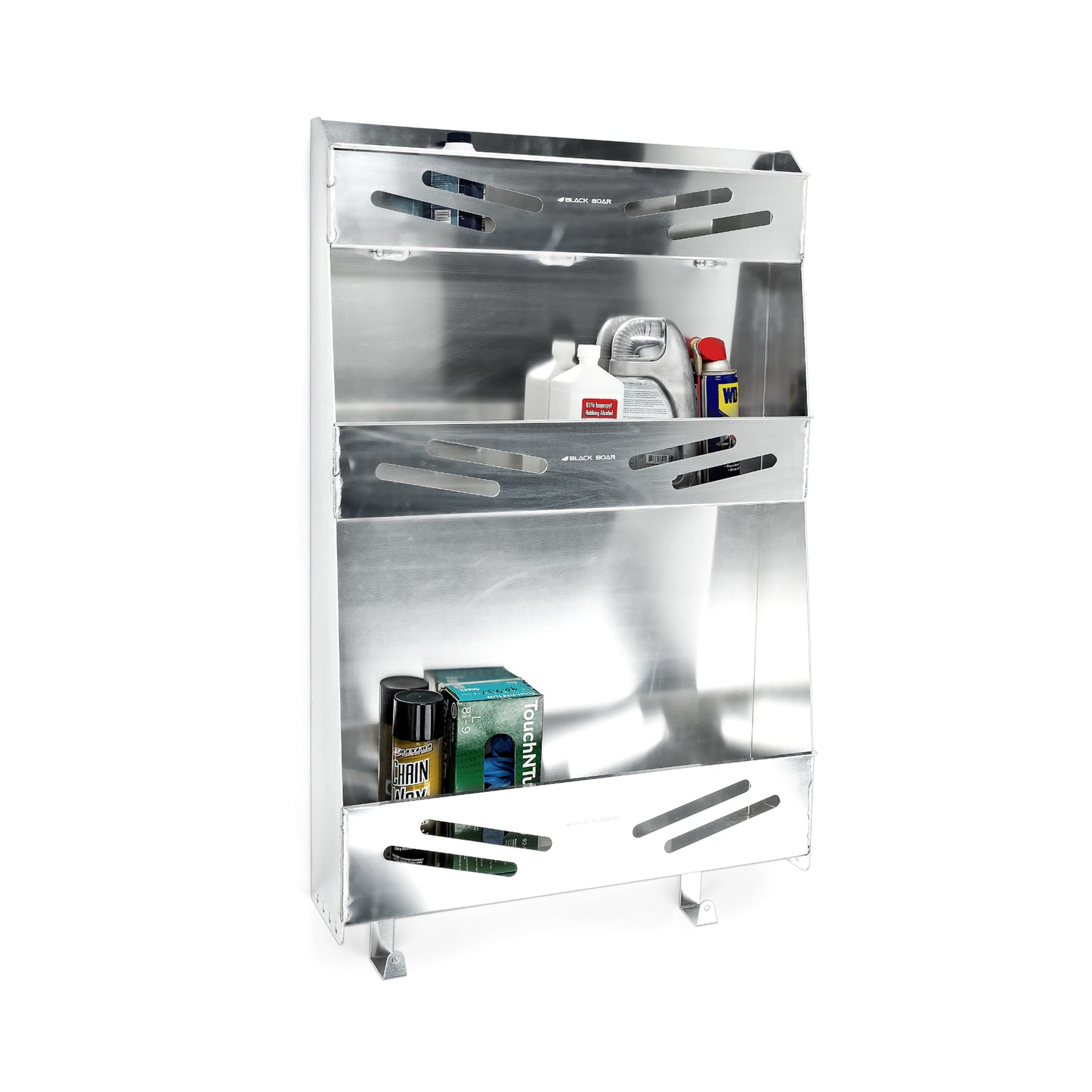 Securely holds a number of items while in transit or at home—such as quarts of oil, aerosol cans and other items
